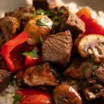In a big bowl, toss the sirloin steak bites, bell peppers, and mushrooms with a splash of olive oil, a pinch of salt, freshly cracked pepper, and a sprinkle of garlic powder. Let your hands get in there—it’s comforting and a great way to bond with your meal!
