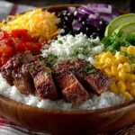 - To assemble the bowls, place some rice or riced cauliflower at the bottom. Add the sliced steak, avocado, black beans, corn, cheese, and red onion.