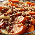 After peeling, cut the sweet potatoes crosswise into 1/2-inch thick slices. Now, here comes the fun part! Alternate layering the sweet potato slices with the apple slices in an 8×8 or 9×9 baking dish—like building a comforting layer of deliciousness.
