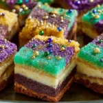 Serve King Cake Cheesecake Bars cold or at room temperature. They make a great dessert for parties, gatherings, or any fun occasion. You can cut them into small squares for easy serving, and the colorful sprinkles add a festive look.