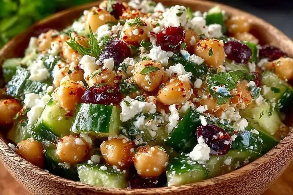 - In a large bowl, combine the chickpeas, cucumber, feta cheese, red onion, and parsley.