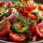 With every bite, the bright crunch of the cucumbers, the juicy burst of tomatoes, and the zing of onions turned any simple meal into a celebration. This salad has become a beloved tradition, bringing people together with its refreshing flavor and comforting simplicity. Trust me; once you try it, you’ll join the army of fans who keep coming back for more, just as I did all those years ago.
