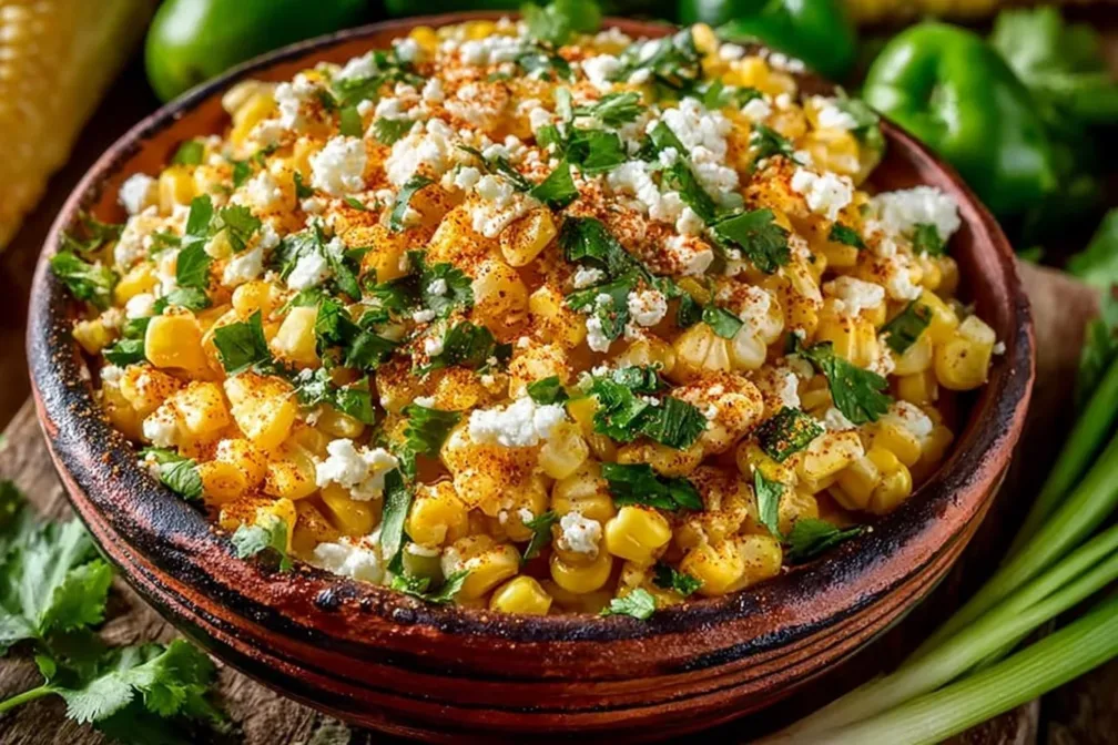 - In a mixing bowl, combine the sweet corn, mayonnaise, crumbled cheese, chopped cilantro, and chili powder.