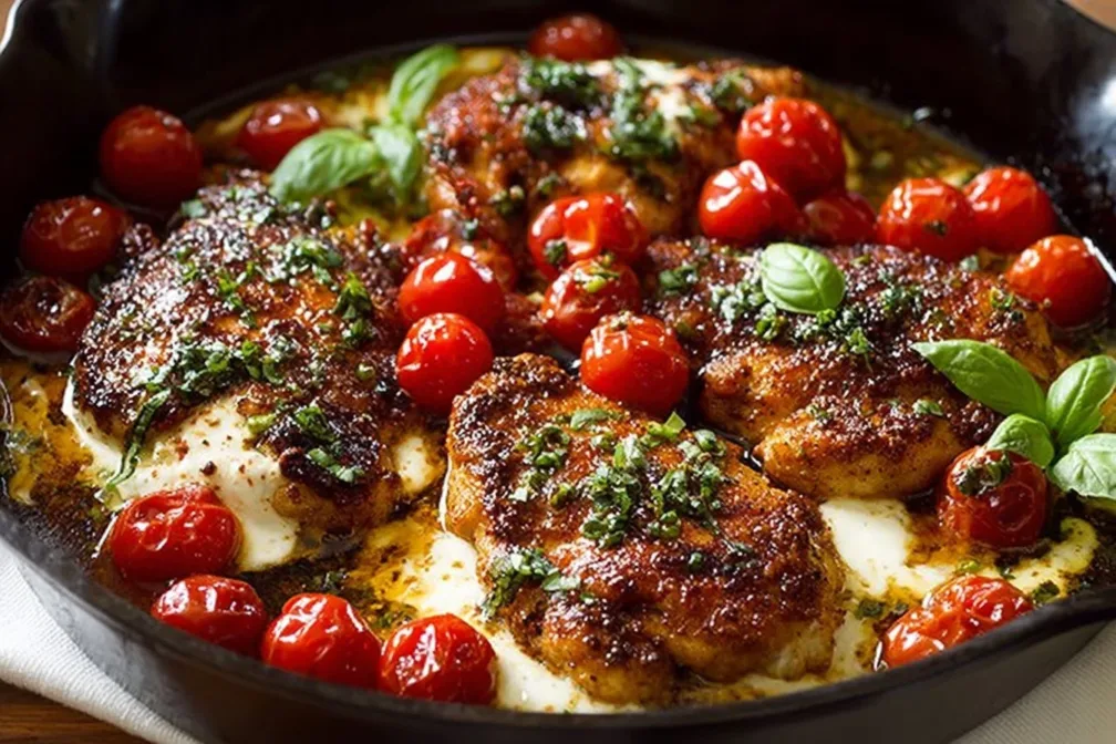 - Transfer the skillet to the oven and bake for 20-25 minutes, until the chicken is cooked through.