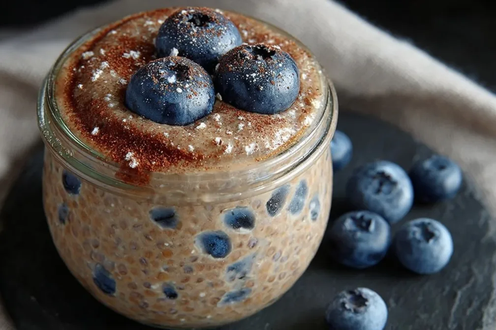 - Stir your chia “porridge” again before serving and top with fresh blueberries.