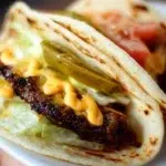 - Assemble: On each tortilla, place a patty, top with shredded lettuce, burger sauce, and pickles. Add any other desired toppings.