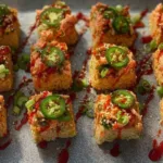 Now it’s time for fun! Take those crispy fried rice squares and top each one with a delightful dollop of mashed avocado, followed by a generous tablespoon of the salmon mixture. Add those beautiful slices of jalapeño on top, sprinkle with both black and white sesame seeds, and finish with a drizzle of sriracha for that extra pop!