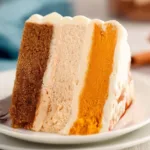 - Layer the cheesecake on top of the pumpkin pie, then layer the cake on top of the cheesecake. Frost the edges with the prepared frosting.